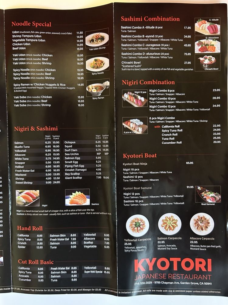 Kyotori Japanese Restaurant, located in Garden Grove, CA, offers a variety of Japanese cuisine with a focus on sushi. The menu includes appetizers like Fish Tempura and Shrimp Tempura, as well as fresh rolls like the Aloha Roll and Baja California Roll. Customers praise the fresh fish, flavorful salads, and generous portions. Reviewers mention the cozy atmosphere and friendly service, making it a favorite casual sushi spot for many. The restaurant also offers vegan and vegetarian options, catering services, and accepts various payment methods, including cryptocurrency. Overall, Kyotori Japanese Restaurant is a must-try for those looking for affordable, quality sushi in a welcoming setting.